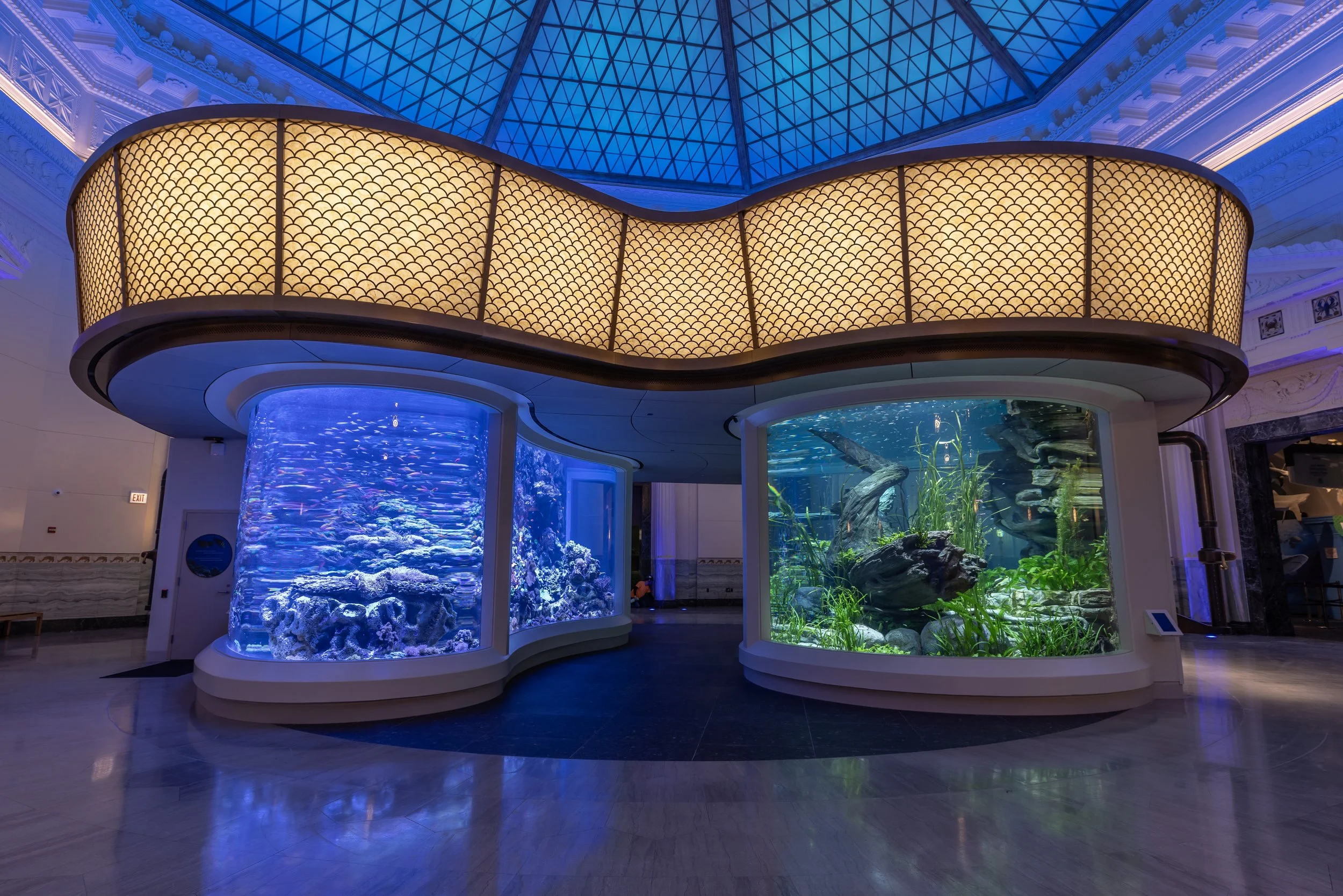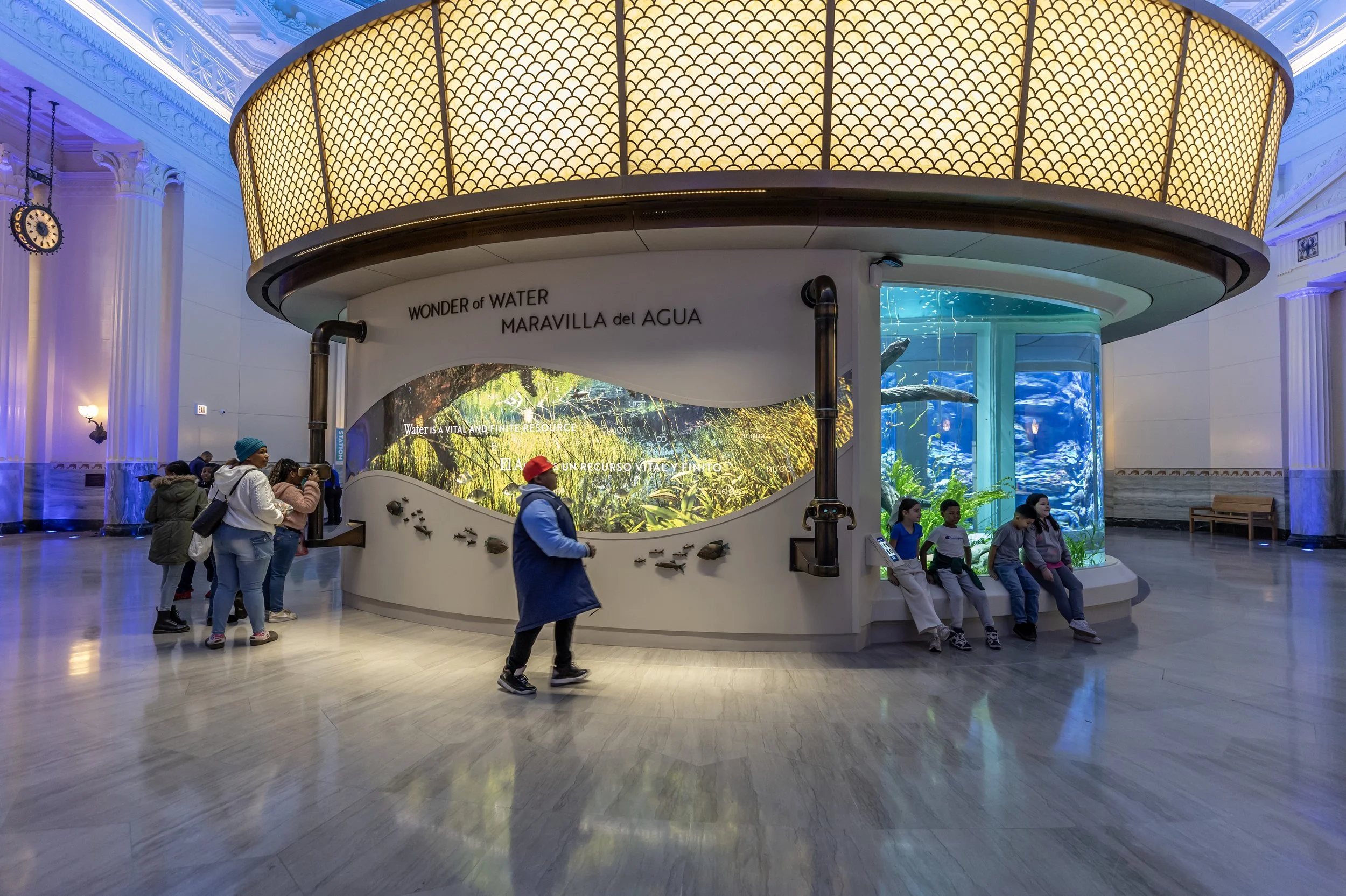 Wonder of Water adorns Shedd’s historic rotunda, blending a recognition of the past with an eye to the future. The ornate gold crown that connects these dazzling habitats draws your eye upward, encouraging you to take in details like intricate marble features, an aquatic-themed Sterling Bronze Company clock and other architectural marvels built nearly 100 years ago.